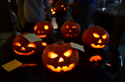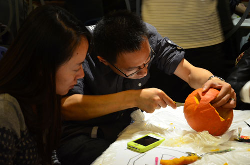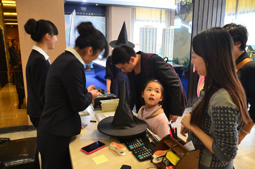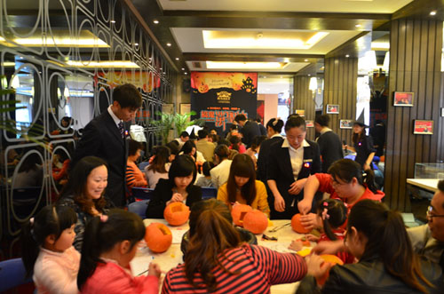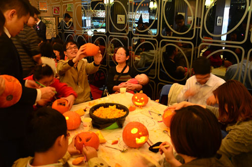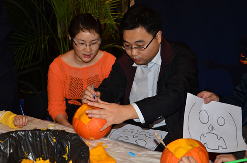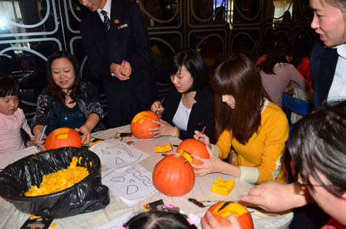 10月27日下午14:30许,美联·西马名仕的售楼部热闹非凡,以家庭为单位,百余人齐聚一室,围坐在五张大圆桌旁。15:30活动准时开始,刀勺锥凿全上阵,全家齐动员,共同欢庆万圣节。大力气的爸爸们认真地掏空南瓜肚皮,巧手妈妈们则负责给南瓜画上眼睛和嘴巴,再按图凿空,小朋友则兴致勃勃要帮这帮那,大家相互比着,笑着,议论着,现场沉浸在一片其乐融融的氛围当中。