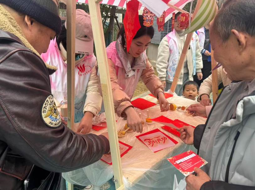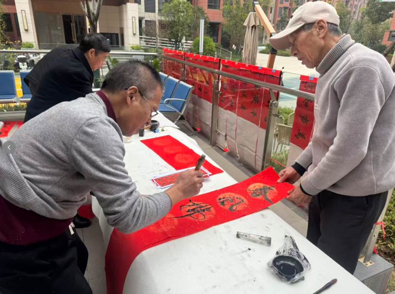 毛笔尖游走红纸,一幅幅对联福字渐渐铺满长桌;