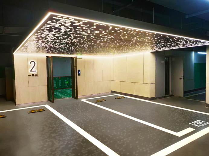 为提升业主对惬意生活的品质需求,地库每个单元主入口增设星空顶、防眩目过渡照明;次通道增加墙面涂装和地面标线;所有车位顶部增加车位号码灯箱,增加归家仪式感的同时提升安全性、营造氛围感,地库升级施工正在进行中。