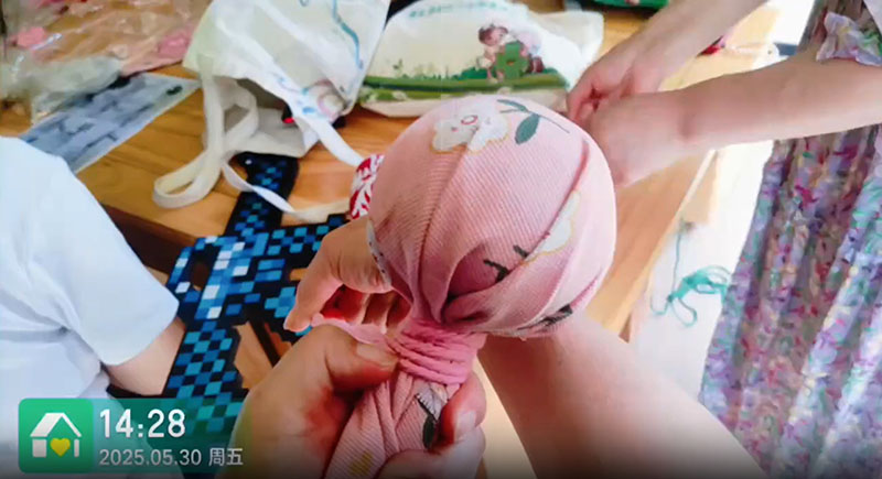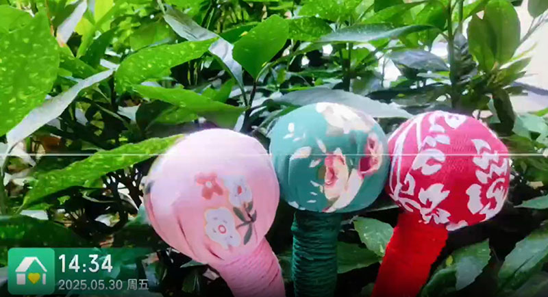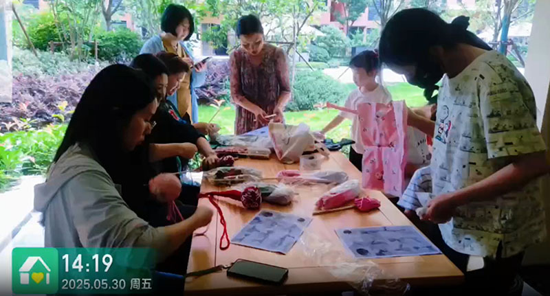 活动伊始,志愿者详细讲解了艾草的药用价值与端午习俗,并现场示范艾草锤的制作流程。从填充天然艾草、缝制棉布锤袋,到缠绕加固,每一步都蕴含着匠人的巧思。业主们纷纷动手尝试,或互相探讨技巧,或专注调整细节,欢声笑语中,一个个圆润饱满的艾草锤逐渐成形。