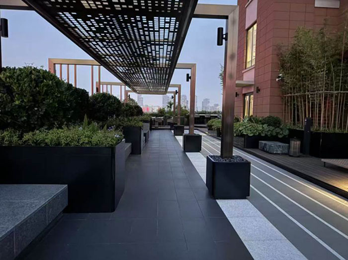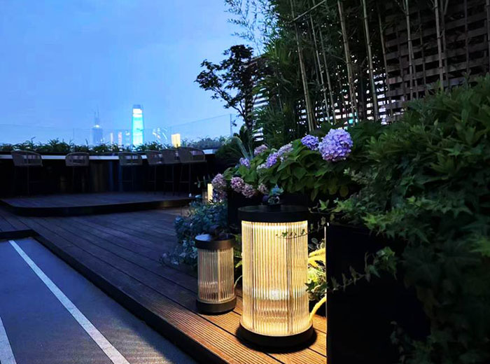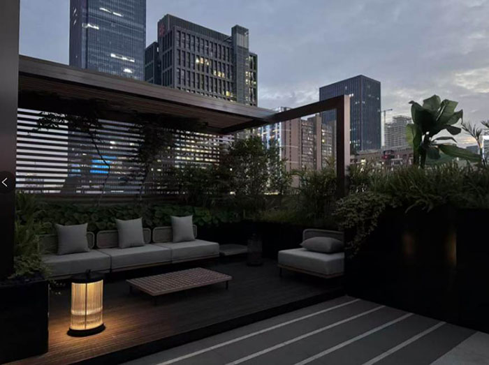 当暮色四合,这里便开启了专属的夜晚模式。木质甲板在灯光晕染下更添质感,几何构型的金属格栅顶棚摇曳着光影,而丛丛翠竹、簇簇绣球与棕榈叶在微风中轻拂,带来城市难寻的自然清凉。