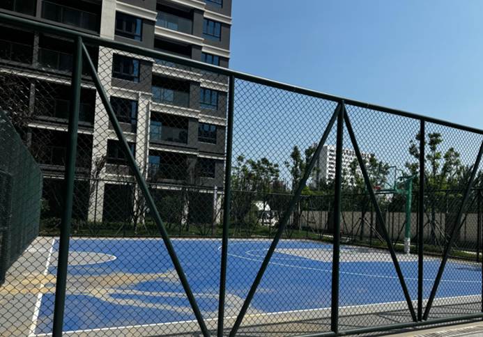 篮球场围护完成,篮球架安装完成,硬质铺装完成60%。