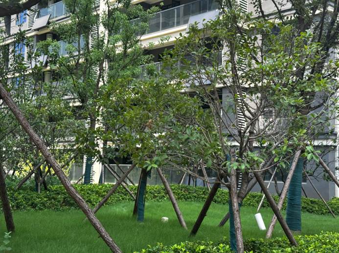 园林绿植细节补栽中,树岛科普乐园矮墙砌体完成;