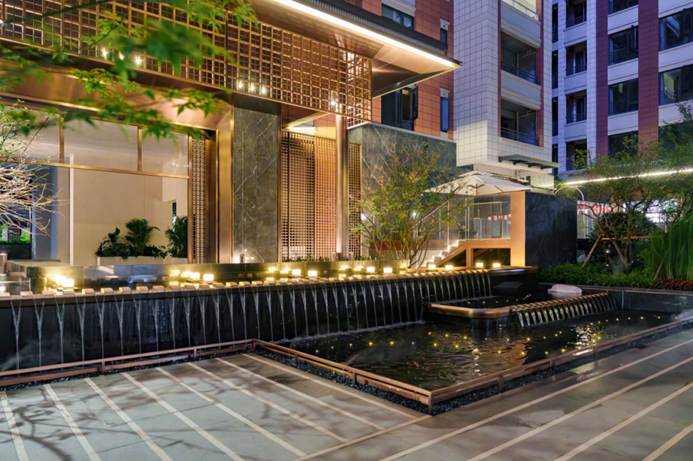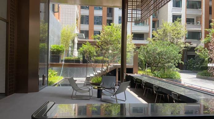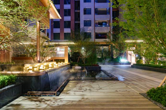 ·回字形围合式园林,复刻里弄尺度,打造四季花镜四时画卷,夜间萤火虫灯带与瀑布雾森系统同时启动,一秒入戏“汉口夏夜”。