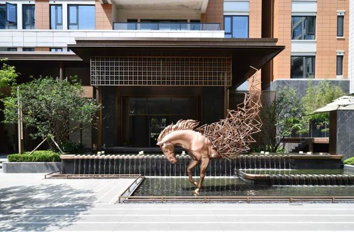 项目方案团队通过还原老汉口街区尺度,保留原有街巷比例,并将百年梧桐、红砖拱券、铜马奔腾等符号转译为景观小品与建筑细部。小区入口沿用旧时公馆的“回字形”院落布局,再植入叠瀑镜面水景、行政酒廊、私宴客厅等现代功能,让“老汉口的生活温度”与“国际都会的私家奢享”在同一空间内交融共振。