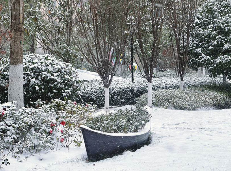 雪后的美联城观格外美丽动人——中央草坪被铺上了一张巨大的雪绒被,风一吹,从树上飘落点点雪花,让人忍不住驻足流连;道路两旁的枝桠镶满水晶,阳光一照,整条路闪着碎银;红墙洋房屋檐垂下一排冰凌帘,长短参差,像自然风铃。