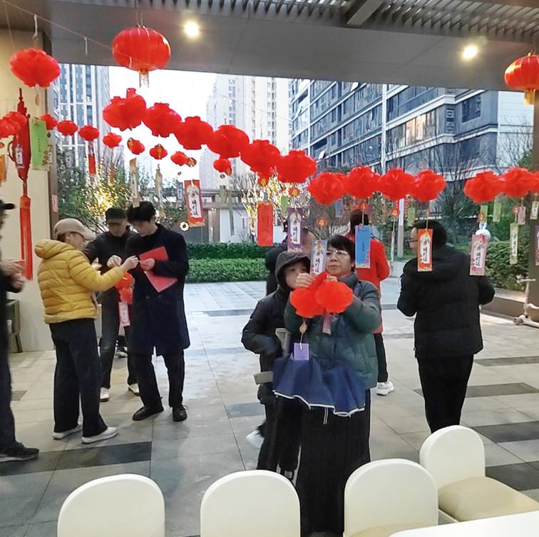 红红火火的灯谜区,是现场最具“脑力挑战”的角落。五颜六色的灯谜条随风摇曳,涵盖成语、民俗、生活常识的趣味谜面,吸引了众多业主驻足思考。