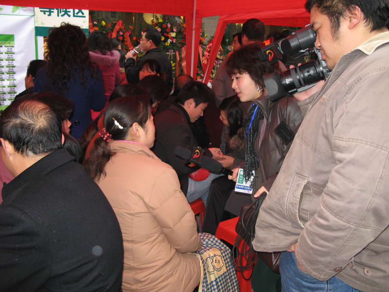 电视台记者在外场采访客户
