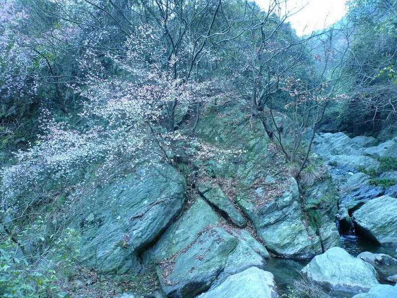 木兰天池素有“湖北九寨沟”的美称,这里树木茂密,溪水淙淙。我们顺溪流蜿蜒,经过小天池、外婆桥、聪明泉,翻越大峡谷、瀑布,穿石走壁,一路而上。在崎岖的山间小道上,不时从转角或山崖窜出一丛山杏花,装点着青翠的山林,也带来春的气息。潺潺流水从身边流过,人在山中走,水在脚下流,别有情趣,合着泉水叮咚的乐曲,大家踏歌而行,欢声笑语洒满山林。