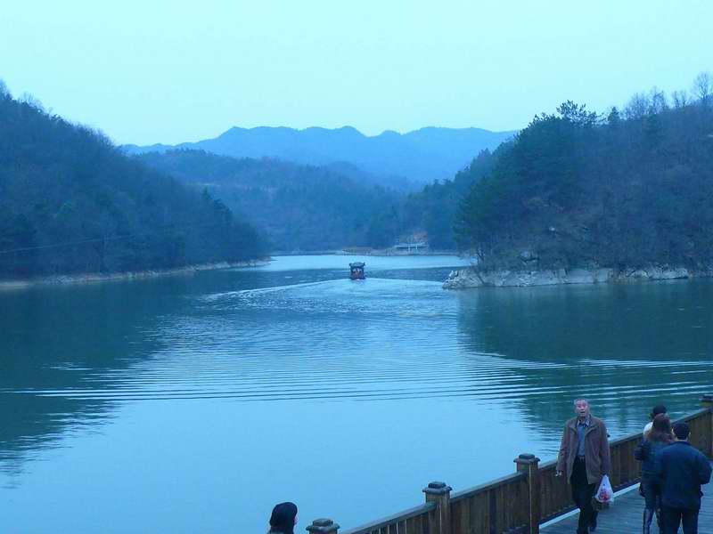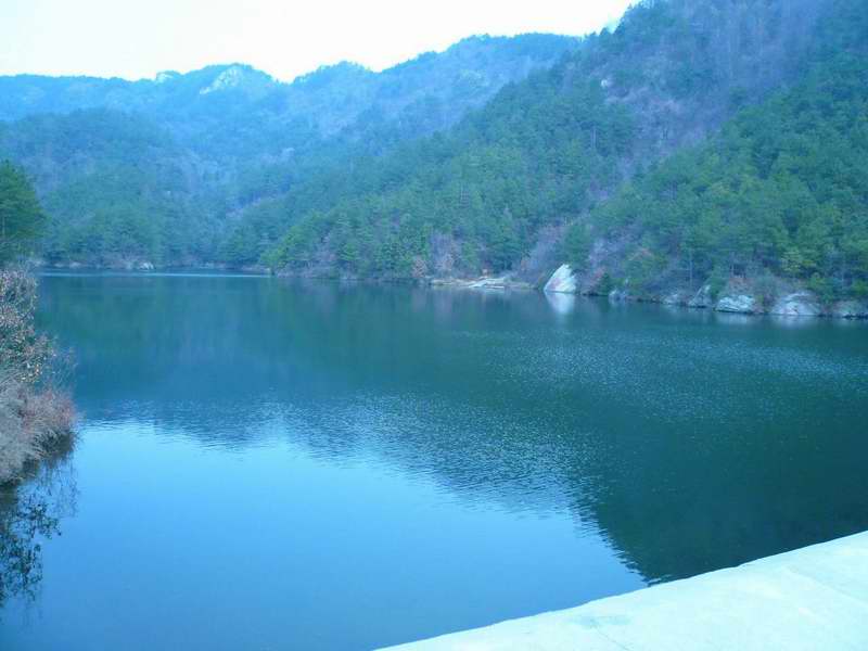 大坝就是美丽的木兰天池了,只见四周的高山峭壁,把天池像宝贝一样揽在怀中,山峦和湖泊在一片绿色中伸展开来,白雾遮着青绿,碧绿衬托氤氲,一潭碧水,深不可测,远远望去,水面就像是一块块透明的玻璃瓦片铺成。面对这山的气势,水的温存,大家早已把自己的疲倦忘得一干二净,沉醉其中。