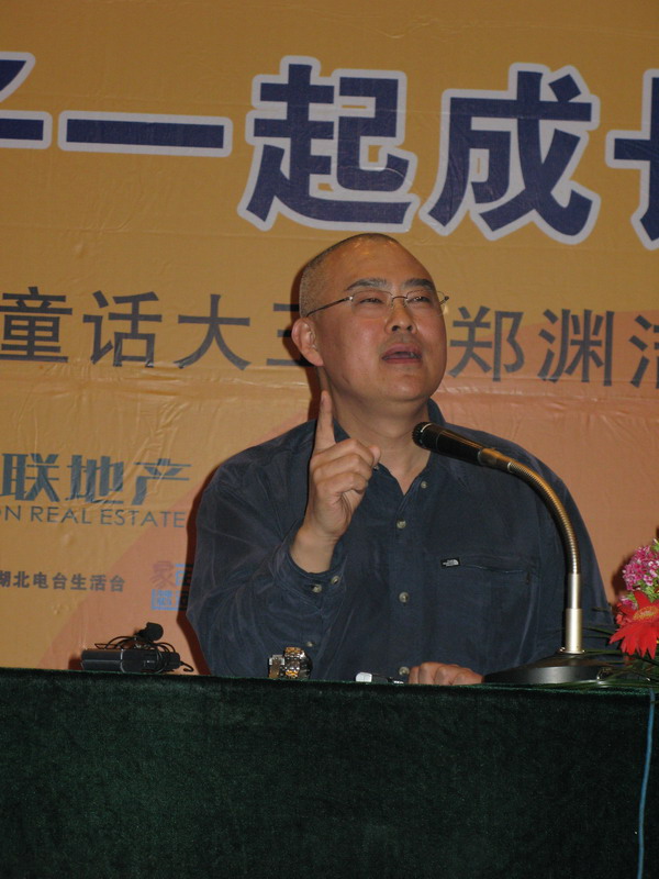 演讲开始,郑渊洁首先聊到了自己的成长,他认为父母对孩子的影响非常大,他小的时候,经常看到父母爬着桌子写字、看书,让他从小觉得写字看书是一个件很神圣的事,所以,萌发了他写作的兴趣。孩子天生具有想像能力、模仿能力和妄想能力,因此,作为家长,最重要的一件事就是:闭上你的嘴,抬起你的腿,走你的人生路演示给孩子看。