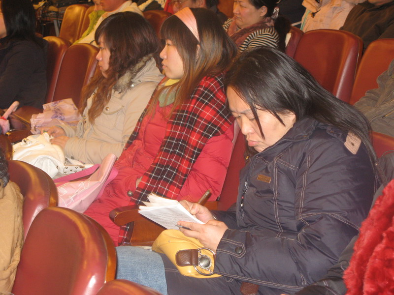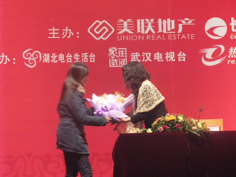 隋丽娟老师虽因意外右手骨折,但任带伤为长江美联大讲坛演讲,演讲结束后,热心观众上台为隋老师献花表示感谢
