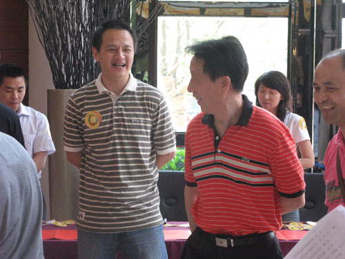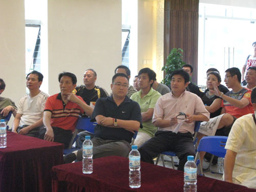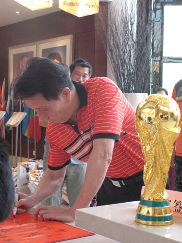 球员代表利用闲暇时间与著名足球教练员肖笃寅热情交流
