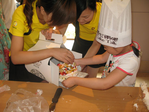 蛋糕终于做好了,这可是我亲手劳动的成果,小心翼翼地放入包装盒内,带回家给爷爷奶奶尝下哦