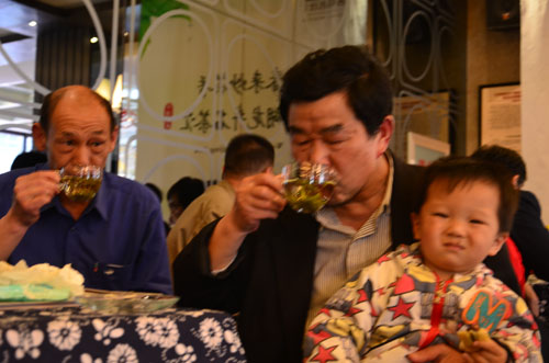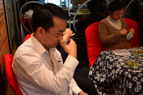 客户现场品尝来自杭州的西湖龙井明前茶,茶香四溢,回味甘甜