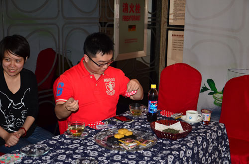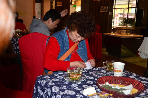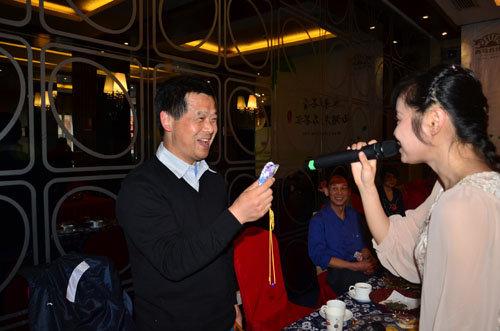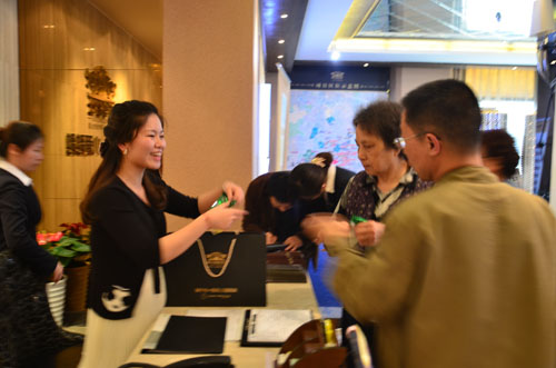 下午2点,客户陆续莅临签到,现场以传统花纹桌布布置,配以古色古香的青瓷茶具,闲雅氛围浓厚,客户身临其中皆感觉心旷神怡。3点整,伴随着优雅清越的古筝独奏,活动正式开始。专业端雅的茶艺师带来问茶、会茶、品茶等茶文化的讲义,并用明前龙井冲泡香茶示范。闻着清香四溢的茶香,看着舒展开的茶叶上下浮沉,让不少客户真真切切体验到了品鉴香茶的那份优雅闲适。而来自杭州的炒茶师以一手娴熟的炒茶工艺博得满堂彩,不少爱茶的客户纷纷提腕炒茶,体验这难得的炒茶机会。随后客户还积极参与到现场茶叶香包的制作中。这种香包味淡而不浓有着提神醒脑的作用,现场气氛热烈,将活动推向高潮。