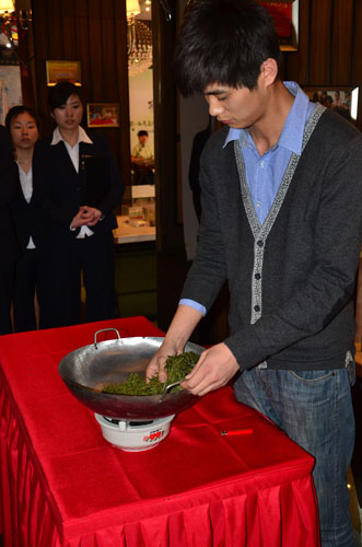 来自杭州的年轻炒茶师现场演示炒茶工艺
