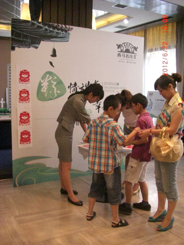 在现场准备了浸泡好的粽叶、糯米等材料,首先由示范老师现场教授包粽子技巧。粽叶、糯米、红枣,简单的原材料,加上一次性手套、勺子及绳子等简单的工具,只见示范老师妙手轻挥,纤指一绕,一个均匀、美观的粽子就包好了。台下的观众们也没闲着,跟着老师有样学样,其乐融融。在经过一番自由练习后,现场开展包粽子比赛,每位选手分配相同数量的粽子叶与其它材料,参赛选手需要用以上材料包出大小均一的粽子,最先用完材料包出粽子且质量好、数量多、场地保持最干净,则评定该组获胜,经过一番精彩激烈的角逐,最后有五位朋友分别获得优胜奖品——精美粽子一盒,当天到访客户也均获得精美幸运手绳一条。享受西马名仕贴心的服务,与同一个圈子的人交流、分享、互动,与家人好友共品劳动果实,共度一个幸福、美满与和谐的端午节,这也许就是这个节日最大的收获。