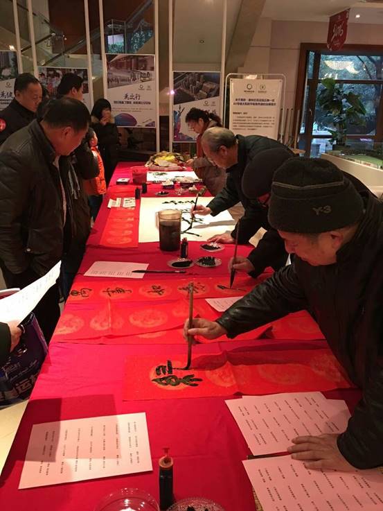 而在一旁的营销中心更是人声鼎沸、热火朝天。一大批奥园书法爱好者正在饶有兴致的施展着作画、书法才华。有的人在向书法爱好者们求字,有的在欣赏名家作画,而有得爱好者们则在即兴吟诗作对,现场在到处充满笑声,到处充满了浓浓的中国年味。