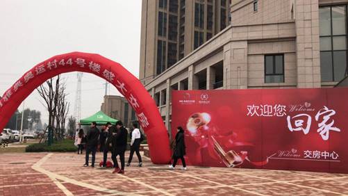 一大早就有不少业主陆陆续续来到交房中心,迫不及待的看看自己的新家,喜庆的红色拱门与围挡让整个小区一片喜气洋洋。