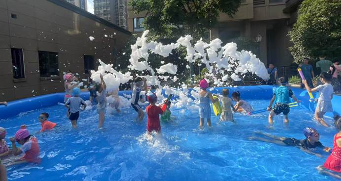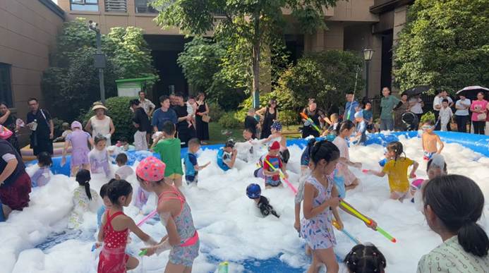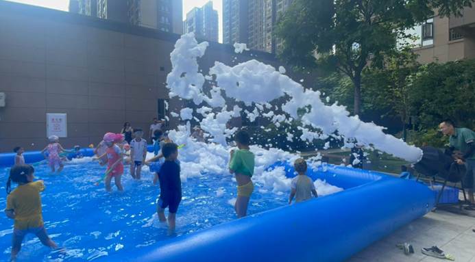7月31日下午4点,在美联城观小区4号楼前空地秒变“水上乐园”。伴随动感音乐,漫天泡沫腾空而起,数名大小业主身穿五彩泳衣跃入泡泡海洋,尖叫声、欢笑声此起彼伏,为39℃的高温按下“清凉键”。