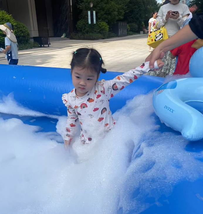 泳镜、水枪、独角兽泳圈……孩子们“全副武装”开战,家长们则在“吃瓜区”支起手机拍照记下这个欢乐瞬间。泡泡机每10分钟“加料”一次,最高喷出3米“雪浪”,直接把气氛推到顶点。3岁半的果果奶声奶气:“妈妈,我在云朵里游泳!”